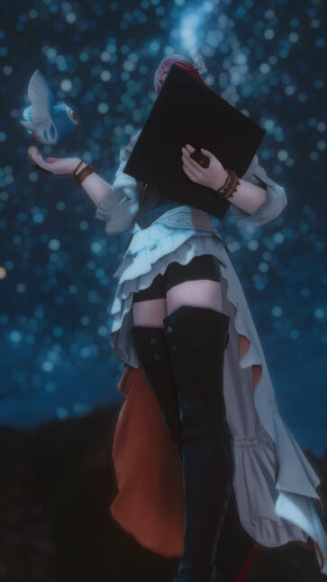 Entrusted to the chief Lore-Master of the School, she began her tutelage in earnest; honing her bond with nature, sharpening her understanding of communion and enriching her lore of how different animals responded to her whims. Her healing hand bettered a great deal too, though in truth, she still secretly laboured to perfect her understanding of how each enchantment may yet be broken. This, in turn, led to a twist of fates, and a notorious meeting with another School... Albeit not wholly one of learning.More summers came and went, and with them, so too did her mentor expire from their School–leaving the young prodigy to her own designs in full. Now, unfettered in full and unburdened by fickle notions such as 'duty' and 'responsibility', she roams the world once more...Or such were her designs, until her siblings' exploits brought upon her attention a whole new concept–that of aether.With her appetite for knowledge rekindled anew, her tinkering with the mind as we know it proceeded unhindered–and it is in such efforts that she devised a means to finally bridge the veil betwixt Eorzea and her own Home... Albeit, it is not known how. All that is known is that word has spread of an errant, heretofore unseen job stone stranding upon Eorzean shores......and of the calamitous currents flowing in its wake.